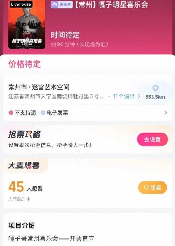 项目详情中写道:嘎子哥首度官宣常州喜乐会开票,从银幕上的硬汉形象转身成为舞台焦点,谢孟伟带着“青春与梦想”的主题热情赴约,开启全新互动旅程!